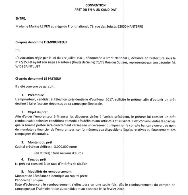 Mediapart also published a second National Front document, which said the funds were to be used for election “expenses” and were to be wired to a bank account opened in Le Pen’s name.